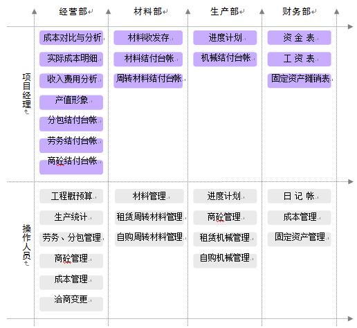 首先是经营部,经营部是用到软件功能最多的部门,主要用到的功能有工程概预算、生产统计、分包管理、劳务管理、成本分析等。