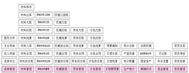材料部门的工作比较杂,计算量也比较大,材料成本占整个成本的70%左右,所以对材料的管理显得尤为重要。利用管理软件提供的功能以及结合我们实际的管理思想,对材料这块管理分为几部分,材料供应商管理、材料合同管理(包括签定、结算、付款)、材料限额管理、材料库的维护以及周转材料的管理等。