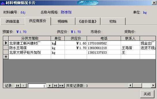 至此计划工作完成,即进入工程实施阶段。材料计划员根据材料计划中的时间及数量进行采购,在这一过程中,比较重要的是各项资源供应信息的维护,这是材料部门日常工作的主要内容,在完成这一工作后,当其在材料计划界面中双击材料时就会出现与之相对应的供货商报价、联系方式及进出场记录等信息来辅助材料员进行对比选择供应商。